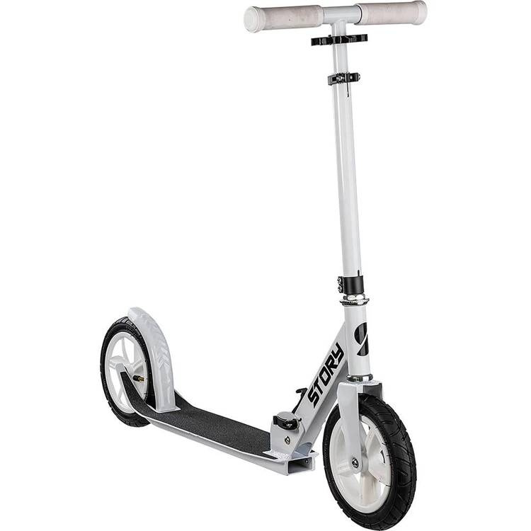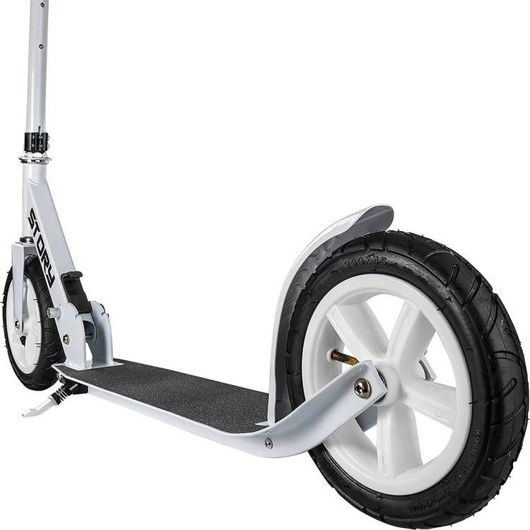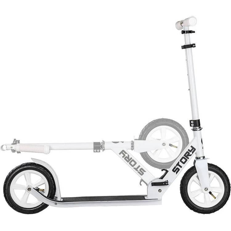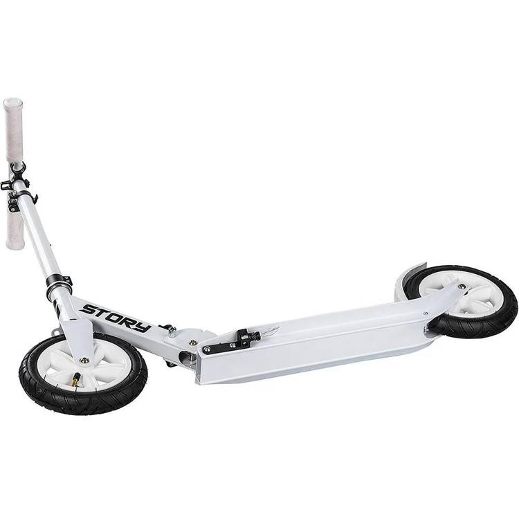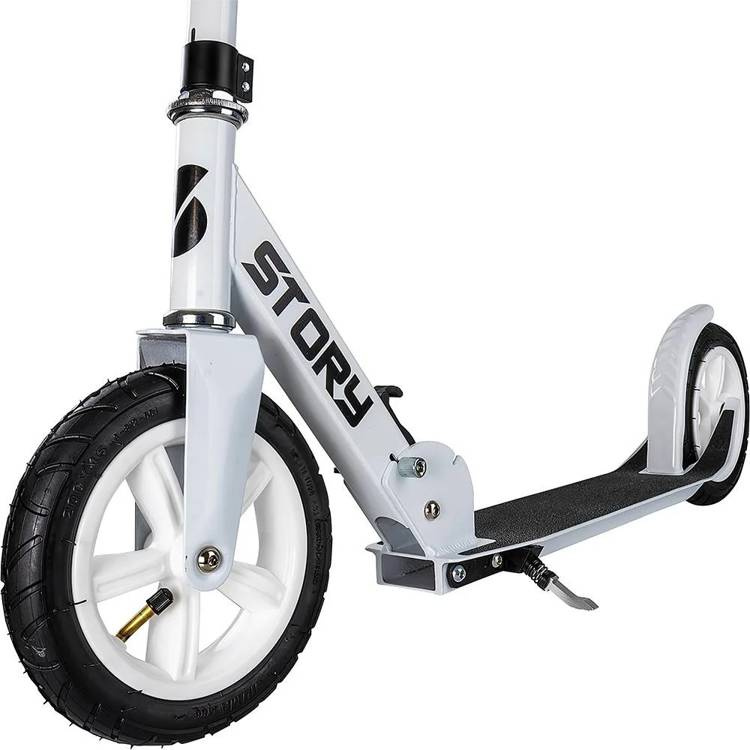 Story Civic byl vybaven nafukovacími gumovými pneumatikami - stejnými jako na jízdním kole, jen menšími! Nafukovací pneumatiky jsou mnohem univerzálnější a pohodlnější, pokud jde o nerovnosti a kameny na silnici. Pro huštění pneumatik jsou vybaveny ventilem Schrader, což je ventil s dříkem pro automobil - k huštění pneumatik můžete použít pumpičku na kolo s adaptérem nebo pumpu na pneumatiky automobilů, kterou najdete na čerpacích stanicích. Velká kola obvykle zvyšují jízdní výšku, ale aby se zachovaly pohodlné odstrkování a stabilní jízdní vlastnosti skútru, byla plošina u modelu Story Civic Comfort speciálně snížena. Vzhledem ke snížené výšce plošiny má koloběžka nízkou světlou výšku, a proto ji nedoporučujeme pro jízdu v terénu.