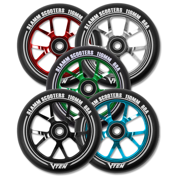 Kola dodávaná společností Slamm, pro výkonné vybavení koloběžek, kompatibilní s většinou koloběžek na trhu. Standardní průměr kol jim dává velkou univerzálnost z hlediska rychlosti, odolnosti, hmotnosti, ceny a stylu. V-ten jsou vyráběny moderní metodou CNC, která zvyšuje stabilitu a plynulost otáčení v ložiskách.