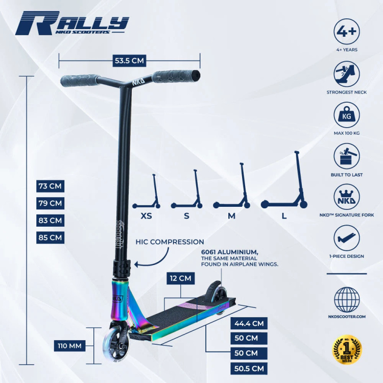 Díky nejvyšším výrobním standardům koloběžky Rally V4 a nejkvalitnějším materiálům - plošině se zesílenými kolejnicemi pro broušení kolejnic z vysoce kvalitního hliníku , řídítkům z chromované oceli, systému komprese vidlice HIC, který zajišťuje absenci vůlí, zvýšenou odolnost a plynulé otáčení řídítek, vysokorychlostním ložiskům ABEC 9, vysoce kvalitnímu polyuretanu o tvrdosti 88A a hliníkovému jádru, z něhož jsou vyrobena kolečka - je koloběžka dostatečně pevná, zvyšuje bezpečnost a umožní vám užívat si zakoupeného výrobku po dlouhou dobu.