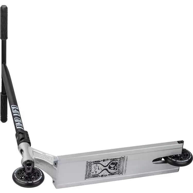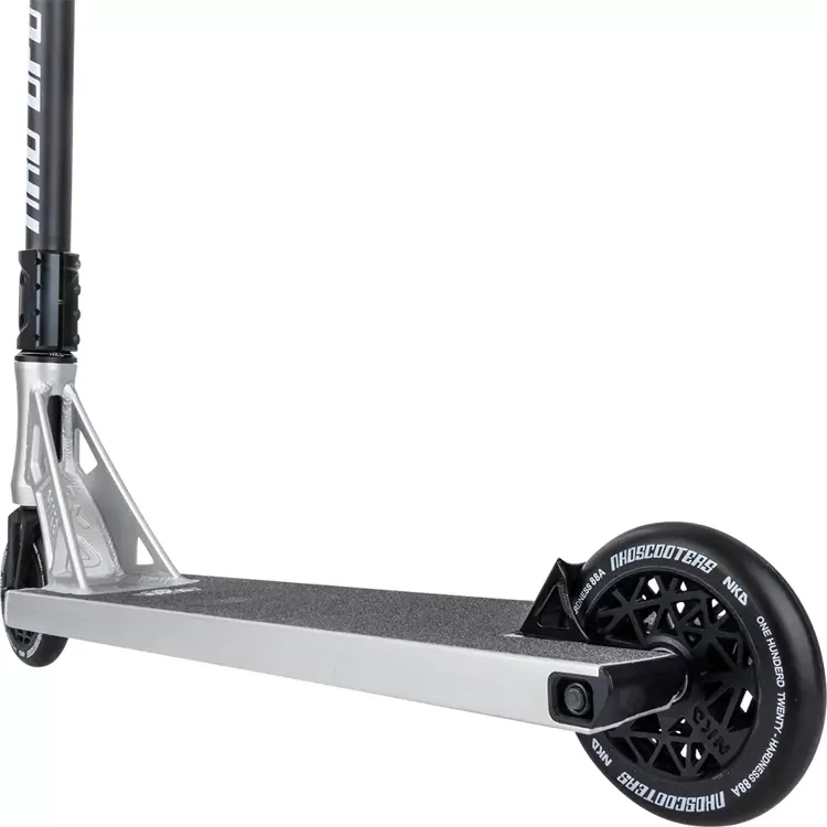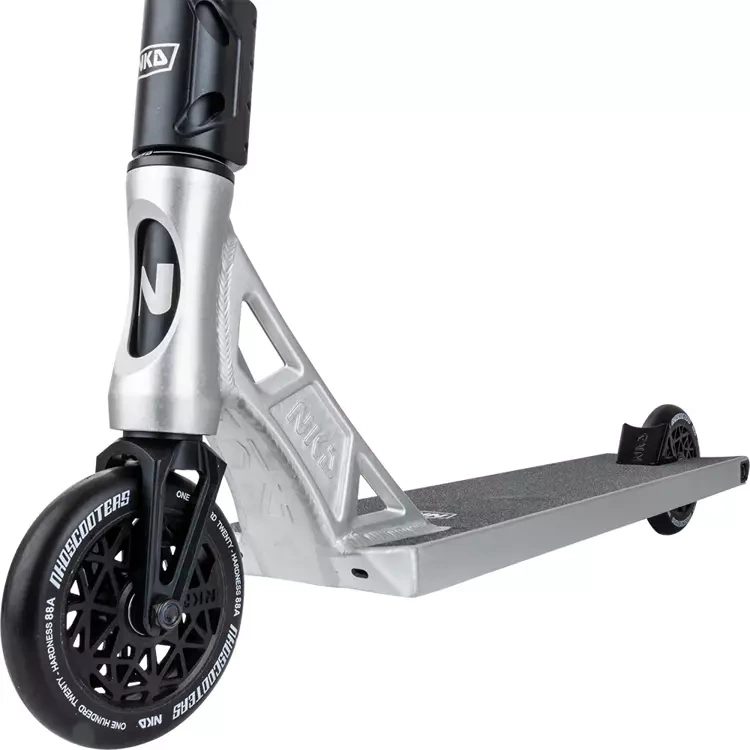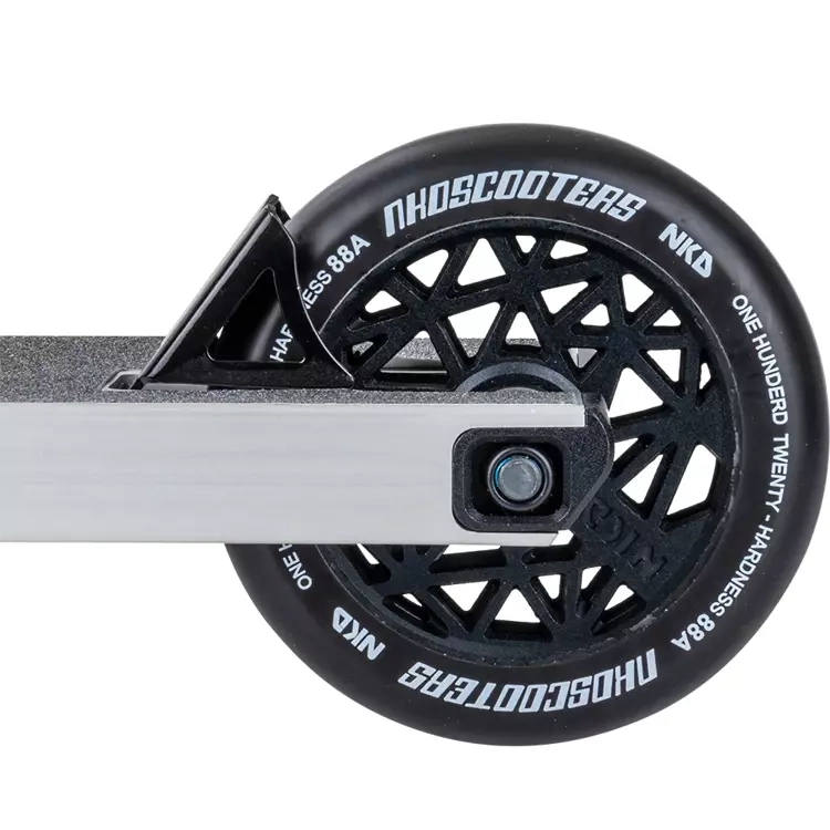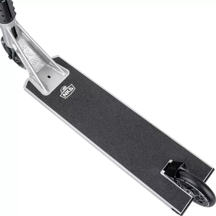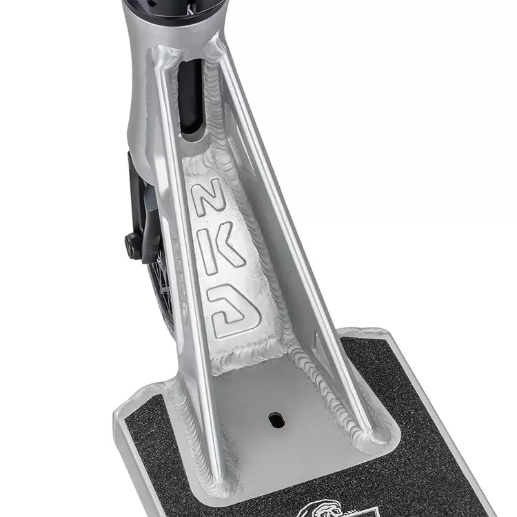 Model NKD UFO je vyroben z nejkvalitnějších materiálů, takže koloběžka je zároveň velmi odolná a extrémně lehká. Váží pouze 4260 gramů! Díky nízké hmotnosti můžete rozhodně snáze provádět triky za letu, aniž byste pociťovali velkou setrvačnost těžkého skútru. Tento model se vyznačuje výjimečně dobrou ovladatelností a citem pro triky na streeetu, ale dobře poslouží i v běžném skateparku.