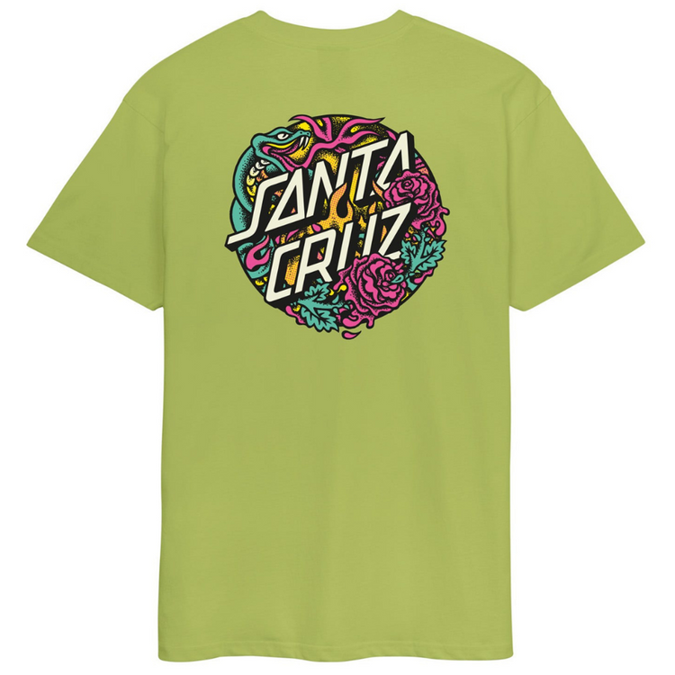 Tričko má hadovitou verzi klasického loga Santa Cruz Dot vytištěnou na levé straně hrudi a výrazněji na zádech.