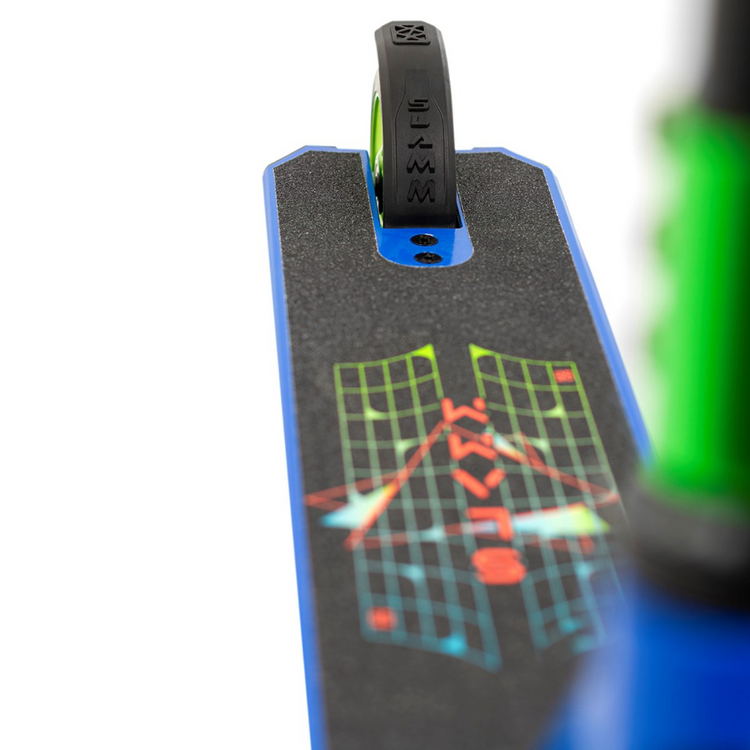 Všechny paluby Slamm jsou tepelně zpracované z materiálu T6 a opatřené bloky, které je chrání před nepovedenými triky a umožní vám užívat si jízdu déle. Paluba tohoto modelu je vyrobena z hliníku 6061-T6, je 495 mm dlouhá a 115 mm široká. Vybaveno polotuhými kormidly NECO 710 s lisovaným těsněním a nylonovými vložkami. Tento skútr je také vybaven skvělou brzdou Flex Fender.