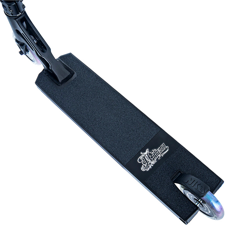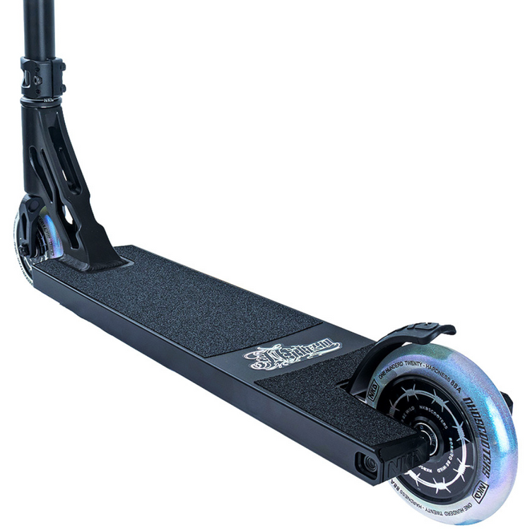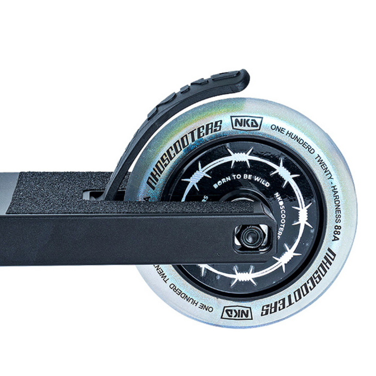 Výkonná koloběžka NKD Nitro je vybavena kolečky o průměru 120 mm s tvrdostí 88 A. Dokonalá kombinace pro hladkou jízdu, i když povrch není dokonale rovný a hladký. Vysoká a široká řídítka ve tvaru písmene T zajišťují skvělou stabilitu. Celé zařízení je uloženo na vysoce kvalitních ložiscích ABEC-9 a dlouhá skříňová platforma zajistí dlouhé a snové skluzy. Můžete si tak být jisti, že vám koloběžka NKD Nitro Performance bude věrně sloužit opravdu dlouho.