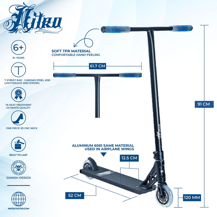Konstruktéři se snažili vytvořit model ideální pro jízdu v ulicích. Koloběžka NKD Nitro Performance je na svou velikost (celková výška 91 cm) velmi lehká (4 300 gramů), takže s ní snadno zvládnete své oblíbené triky. Zároveň vydrží maximální zatížení 100 kg a pevnost materiálu je až T6. To znamená, že hliník byl stlačen silou až 6 tun, aby se posílila pevnost materiálu. To zaručuje, že koloběžka vydrží přistání i po velmi vysokých skocích.