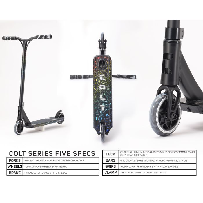 Zcela nová řada koloběžek Colt Series 5 "Little Weapon" byla navržena s použitím vysoce kvalitních komponentů z proslulé modelové řady Prodigy - jde o mimořádně propracovaný výrobek za výjimečnou cenu!