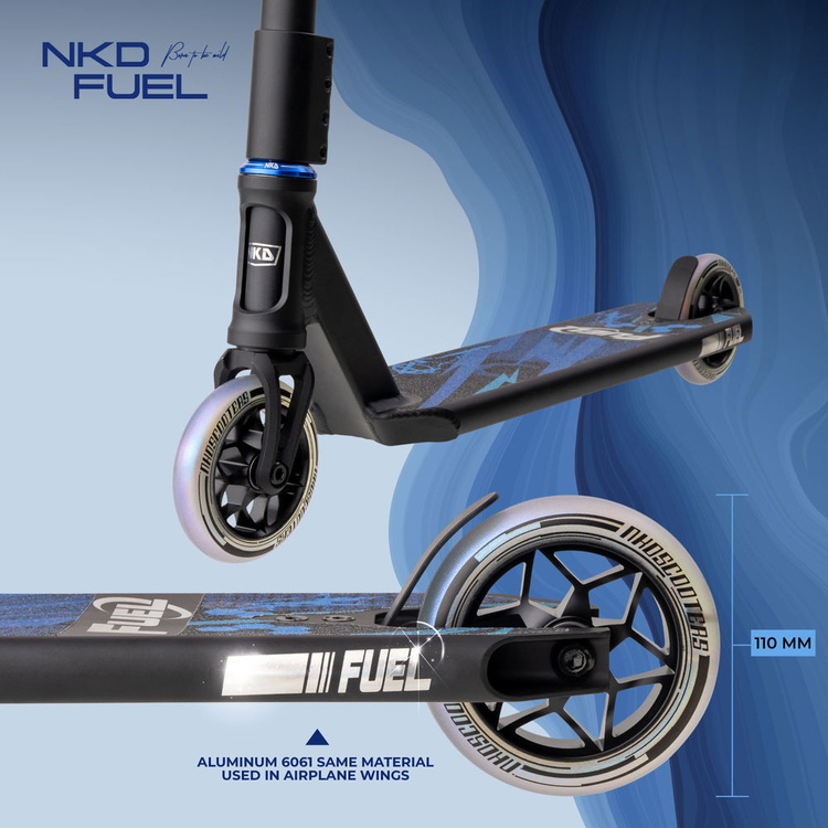 Vysoce výkonná koloběžka NKD Fuel byla vytvořena tak, aby splňovala požadavky všech nadšenců, kteří chtějí objevovat nové triky ve skateparku nebo vyrazit do ulic s lehkostí a skvělým stylem. Díky své všestranné konstrukci je jednou z nejlehčích a nejodolnějších koloběžek na trhu.