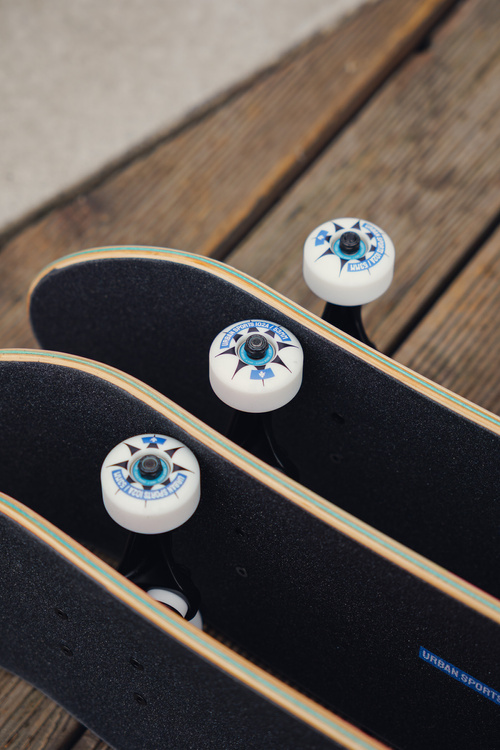 - Plochá kolečka Urban Sports o průměru 53 mm a tvrdosti 102A - jsou tvrdá a ideální pro učení triků, usnadňují také powerslidy a přinášejí spoustu zábavy