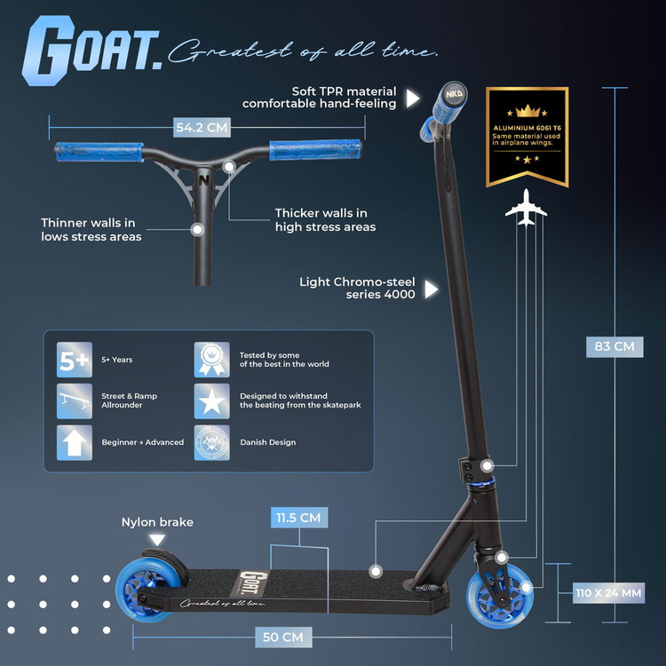 NKD GOAT neboli "Greatest of All Time" je koloběžka určená pro začátečníky a pokročilé jezdce od 5 let. Ať už jezdíte ve skateparku, na streeetu nebo na jiném přístupném místě, tento model bude skvělou volbou. Testováno profesionálním týmem NKDscooter, je navrženo tak, aby vydrželo intenzivní používání. Model GOAT, vyrobený z nejlepších materiálů používaných při výrobě freestylových koloběžek, má ultralehkou konstrukci, která usnadňuje provádění triků a zlepšování dovedností.