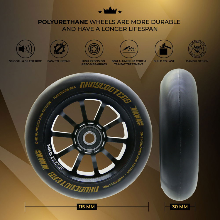 • Kolečka NKD IDC o průměru 115 mm jsou pevným základem výkonné koloběžky - hliníkové jádro, ložiska ABEC-9 a tvrdost 88A poskytují maximální kontrolu a styl. Dánská přesnost a odolný polyuretan dělají z každého triku potěšení.