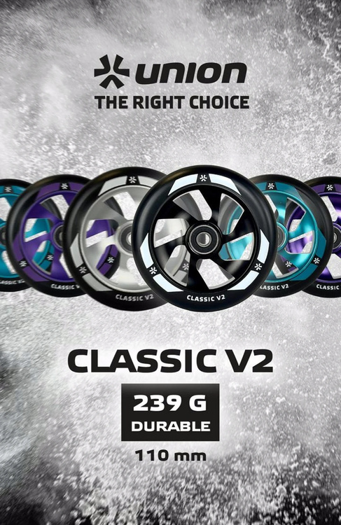 • Union Classic V2 Pro je lehké, stylové kolečko o průměru 110 mm s hliníkovým jádrem a ložisky ABEC-9, které vám zajistí skvělou plynulost při jízdě na stezce i ve skateparku. Odolnost, design a přesnost - vše, co potřebujete k pokroku.
