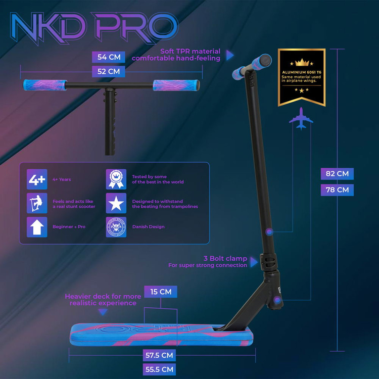 Na rozdíl od běžných trampolínových koloběžek má model NKD Pro palubu se záměrným posunem rozložení hmotnosti směrem ke konci. Díky této jedinečné konstrukci je provádění triků, jako je například švihání ocasem, plynulé, a jezdci tak mohou snadno zvládnout tyto typy triků. Ať už trénujete na trampolíně, nebo cvičíte v parku, tato koloběžka vám zajistí, že budete vždy v nejlepší formě.
