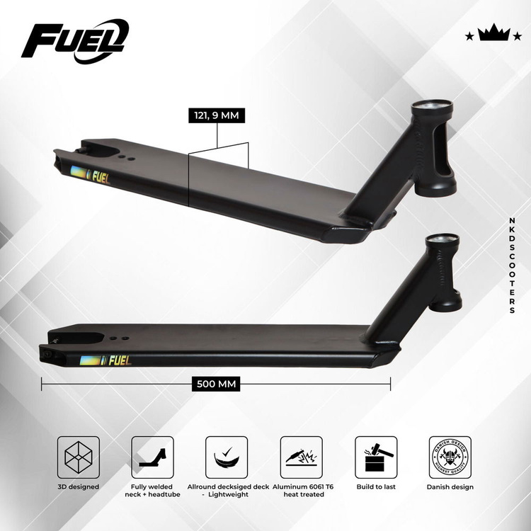 • Palubní deska NKD Fuel Deck je lehká a robustní platforma z lehkého a pevného hliníku, která zaručuje stabilitu a pohodlí při jízdě. Její chytrý tvar a konkávní desky zajišťují skvělou kontrolu koloběžky při tricích.