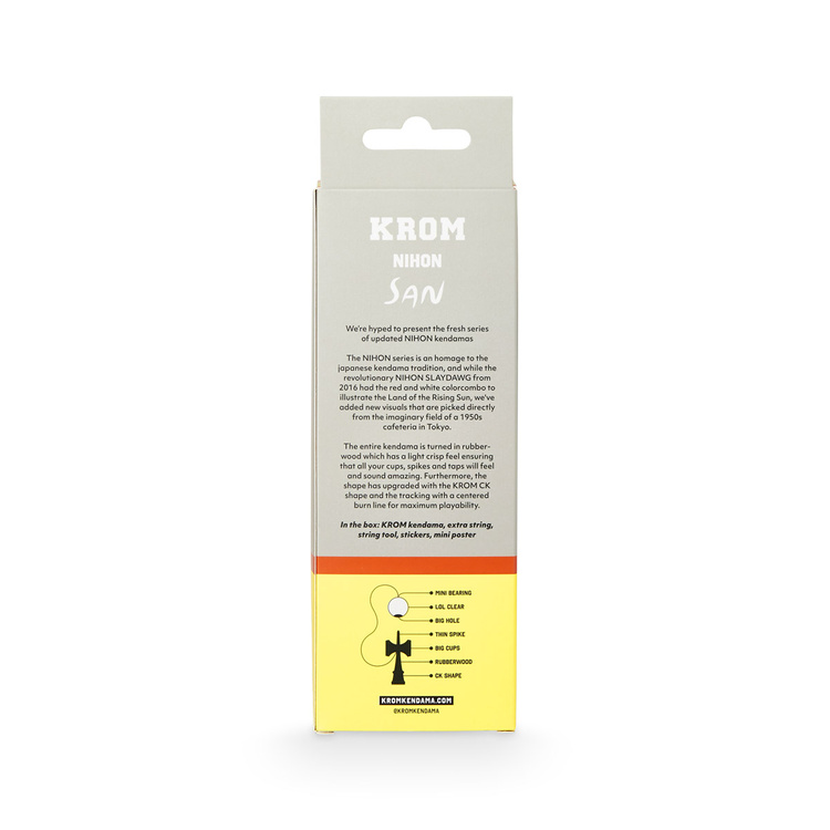 KROM Nihon je kendama vytvořená pro ty, kteří považují aktivitu za součást svého každodenního životního stylu. Díky pokročilému tvaru CK a jedinečné kombinaci kaučukového dřeva s lepivou bezbarvou povrchovou úpravou LOL poskytuje vynikající kontrolu a plynulost pohybu - od prvního triku až po pokročilé sekvence. Její pastelově zbarvená, dobře viditelná hráz nejen usnadňuje sledování za běhu, ale také dodává energii jakémukoli přístupu ke hře.