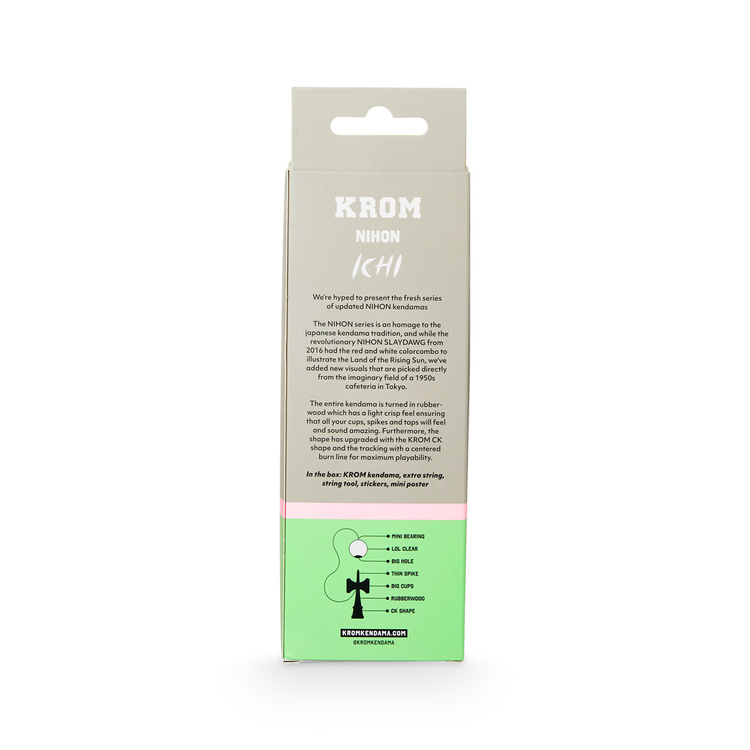 KROM Nihon je kendama vytvořená pro ty, kteří považují aktivitu za součást svého každodenního životního stylu. Díky pokročilému tvaru CK a jedinečné kombinaci kaučukového dřeva s lepivou bezbarvou povrchovou úpravou LOL poskytuje vynikající kontrolu a plynulost pohybu - od prvního triku až po pokročilé sekvence. Její pastelově zbarvená, dobře viditelná hráz nejen usnadňuje sledování za běhu, ale také dodává energii jakémukoli přístupu ke hře.