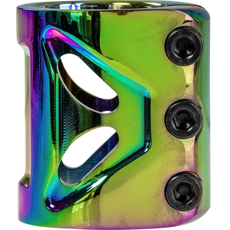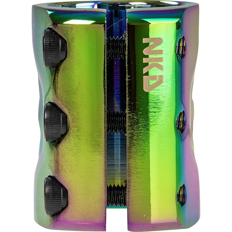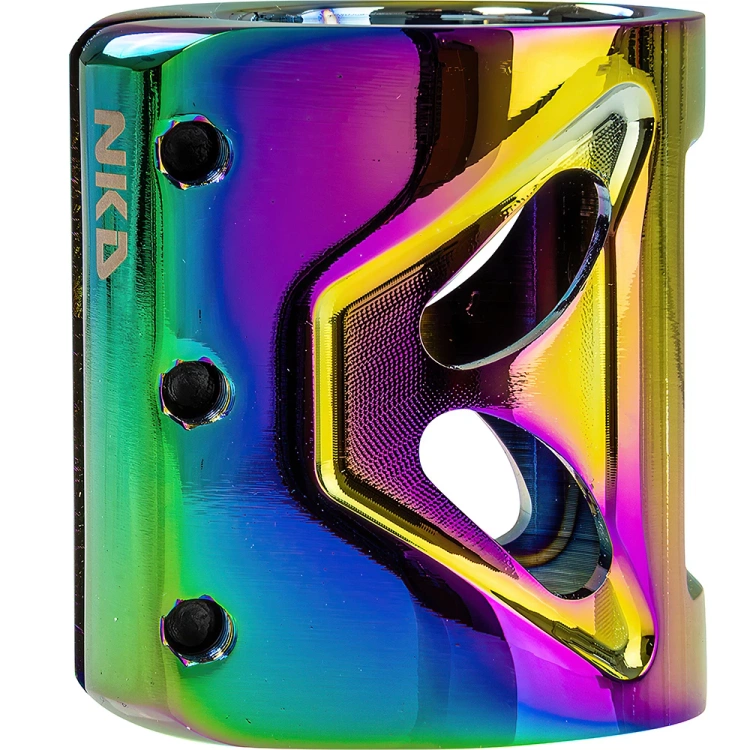 • Svorka NKD Fuel Clamp je trojitá, lehká výkonná svorka na koloběžku s mimořádně pevnou hliníkovou konstrukcí, která vám zajistí bezpečné uchycení řídítek při každém triku. Kompatibilita se systémy HIC, IHC a ICS.