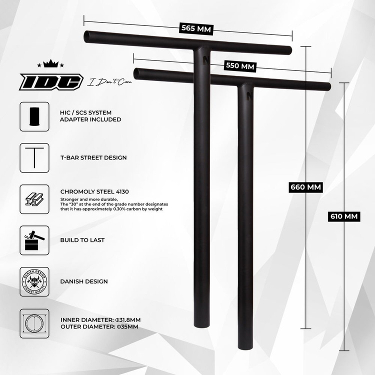 Řídítka NKD IDC jsou volbou pro jezdce, kteří berou jízdu na skútru nejen jako sport, ale také jako největší zábavu. Je to zařízení, které se řídí vaším rytmem - nebo spíše: předvídá ho. Je vyroben ze spolehlivé oceli Cr-Mo 4130 a dokončen v klasickém surovém designu T-bar, který dokonale kombinuje surový pouliční charakter s vytříbenou kvalitou provedení. Ať už děláte triky na sportovištích, nebo jen jezdíte po městě, můžete si být jisti, že každý váš pohyb bude přesný a vaše vybavení vás nezklame. S ohledem na různé jízdní styly jsou k dispozici dvě konfigurace: 610 × 550 mm a 660 × 565 mm. Díky tomu můžete řídítka přizpůsobit tvaru své postavy a preferencím. Kombinace funkčnosti, odolnosti a stylu - ideální pro městské sportovce, kteří neuznávají kompromisy.