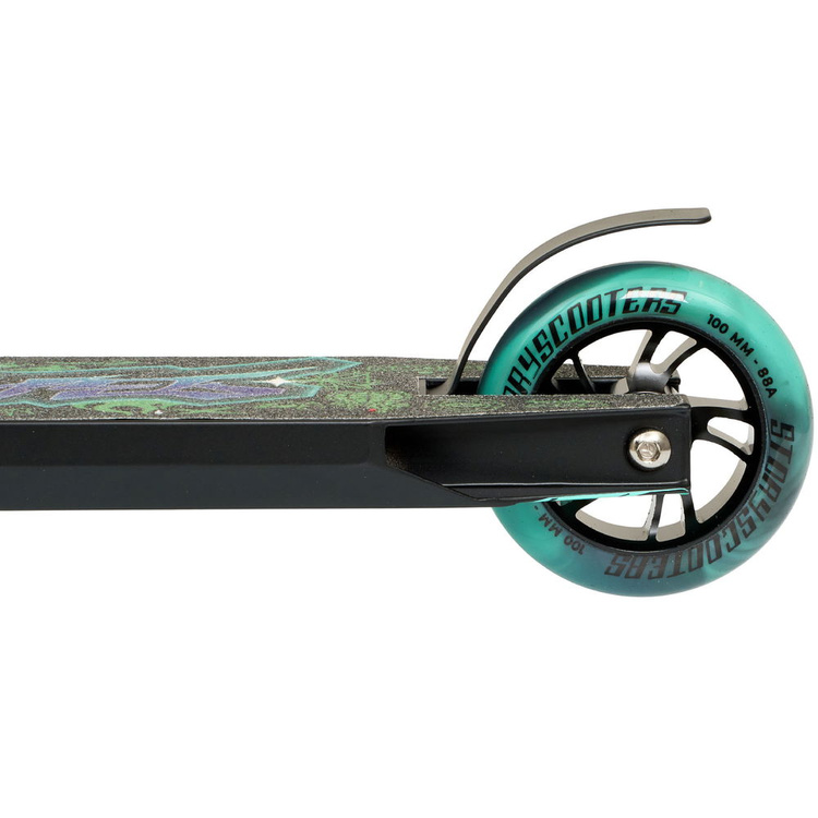 Platforma Story Bandit DOS z odolné hliníkové slitiny 6061 s posuvnými kolejnicemi pro snadnější broušení kolejnic. Díky 100mm kolečkům lze tuto koloběžku s jistotou používat k provádění triků, ale také ke každodenní jízdě. Společně se Story Bandit DOS je čas dobýt ulice a předvést svůj styl!