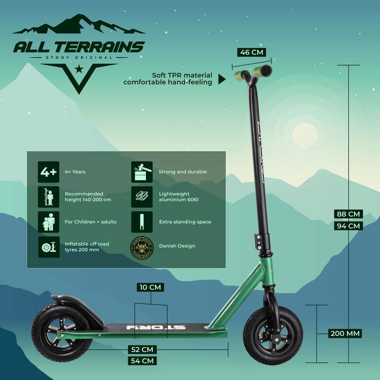 • Story All Terrains Dirt je terénní koloběžka, která je ideální pro jízdu v lese nebo na silnici. Koloběžka je doporučena pro děti a dospělé s výškou cca. 140-185 cm. Díky nafukovacím kolům ji můžete použít prakticky kdekoli!