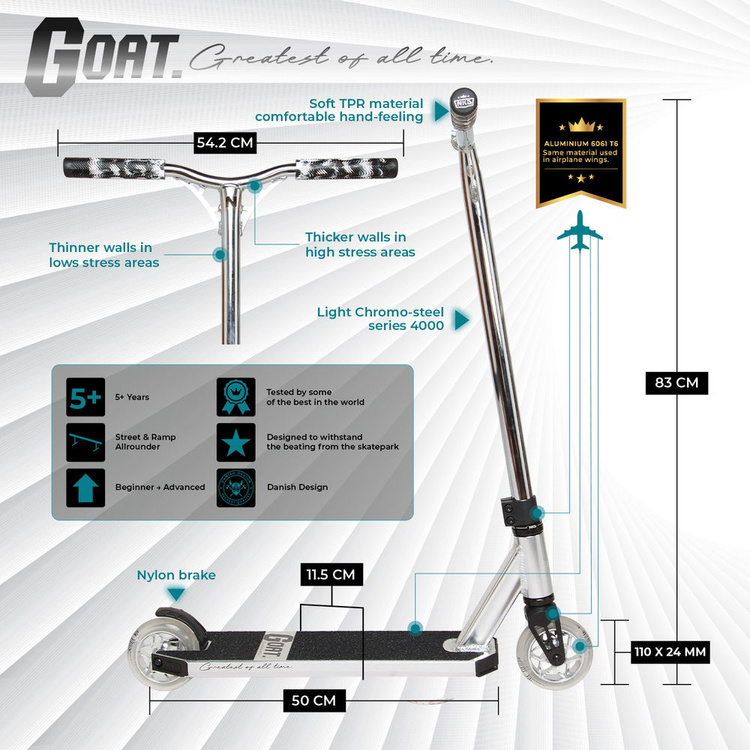 Model GOAT, vyrobený z nejlepších materiálů používaných při výrobě freestylových koloběžek, má ultralehkou konstrukci, která usnadňuje provádění triků a zlepšování dovedností.