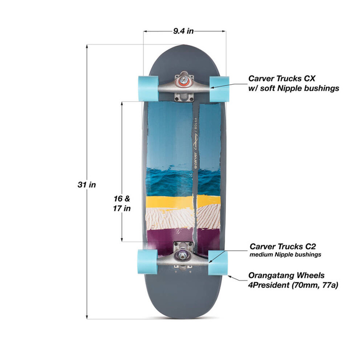 Loaded X Carver Bolsa CX to fenomenalna deska surfskate, stworzona w wyniku wyjątkowej współpracy między Loaded i Carver, która narodziła się z lat wzajemnego podziwu tych marek. Jest kompaktowa, wygodna i zwrotna w wyniku połączenia rewelacyjnego systemu CX Loaded i surfskate od Carver.