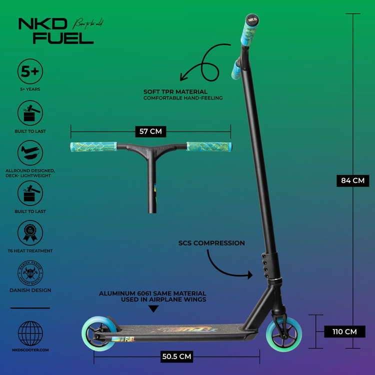 Hulajnoga wyczynowa NKD Fuel została stworzona, aby sprostać wymaganiom każdego pasjonata, który chce eksplorować nowe tricki w skateparku lub z łatwością i w świetnym stylu poruszać się po ulicach. Dzięki wszechstronnej konstrukcji jest jedną z najlżejszych i najbardziej wytrzymałych hulajnóg dostępnych na rynku.