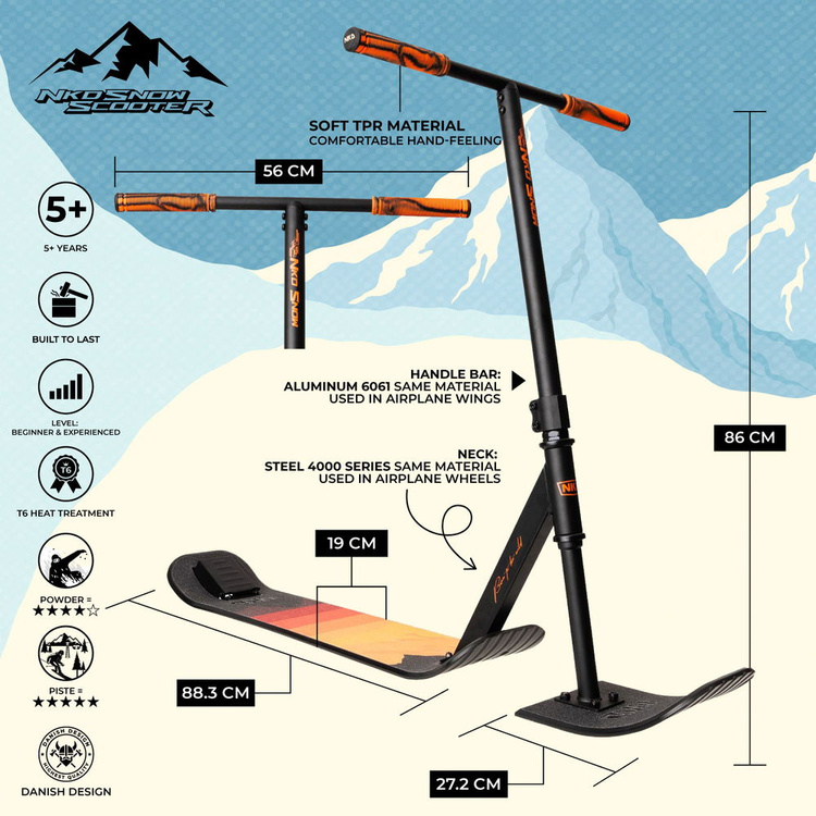 • NKD SNOW Stunt Scooter to hulajnoga wyczynowa do jazdy i wykonywania tricków na śniegu zaprojektowana dla dzieci i młodzieży w wieku od 5 lat wzwyż i łączy w sobie najlepsze cechy hulajnogi wyczynowej i snowboardu.