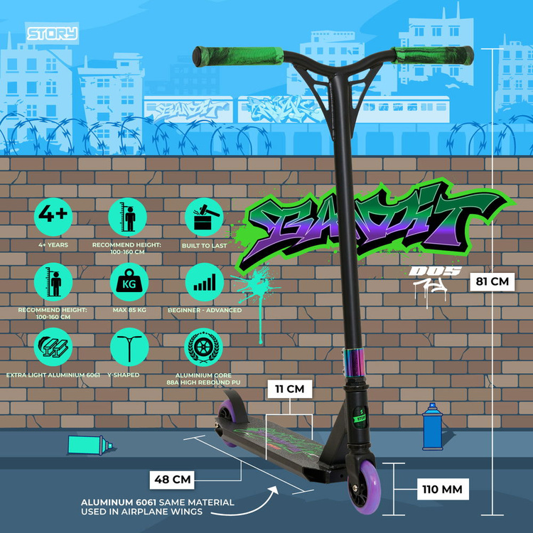Story Bandit DOS to hulajnoga wyczynowa przeznaczona dla dzieci o wzroście od ok. 95 do 150 cm. Idealna dla początkujących riderów, zdecydowanie warta uwagi ze względu na super atrakcyjną cenę, wysoką jakość materiałów i wykonania! Jeśli szukasz hulajnogi odpowiedniej na skatepark, do robienia ulicznych tricków czy po prostu do jazdy w Twojej okolicy to Story Bandit DOS jest dla Ciebie idealnym wyborem!
