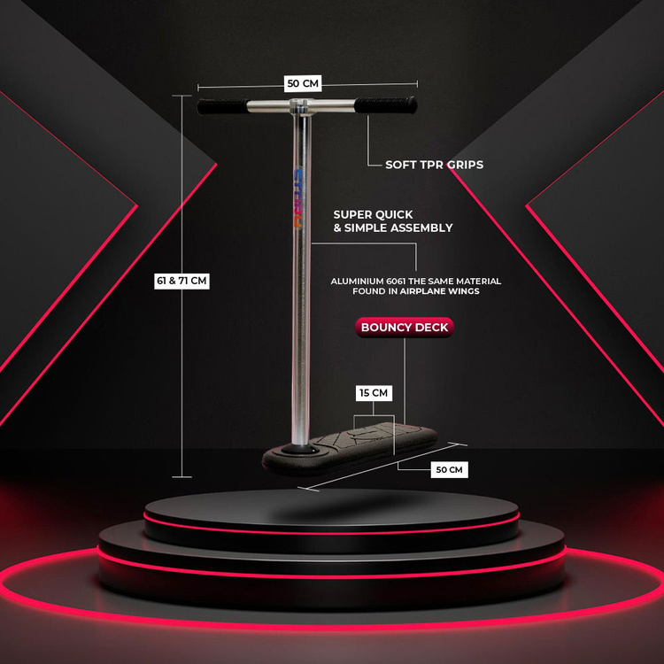 Zanurz się w ekscytującym świecie zaawansowanych tricków na trampolinie dzięki Story Trampoline Scooter, czyli innowacyjnej hulajnodze wyczynowej na trampolinę! Została ona specjalnie zaprojektowana, aby zwiększyć Twoje umiejętności scootingu, zarówno na trampolinie, jak i w pomieszczeniach. W przeciwieństwie do tradycyjnych hulajnóg, Story Trampoline Scooter został celowo zaprojektowany do użytku bez kół, co zapewnia bezpieczne i kontrolowane środowisko do ćwiczenia i doskonalenia swoich tricków.