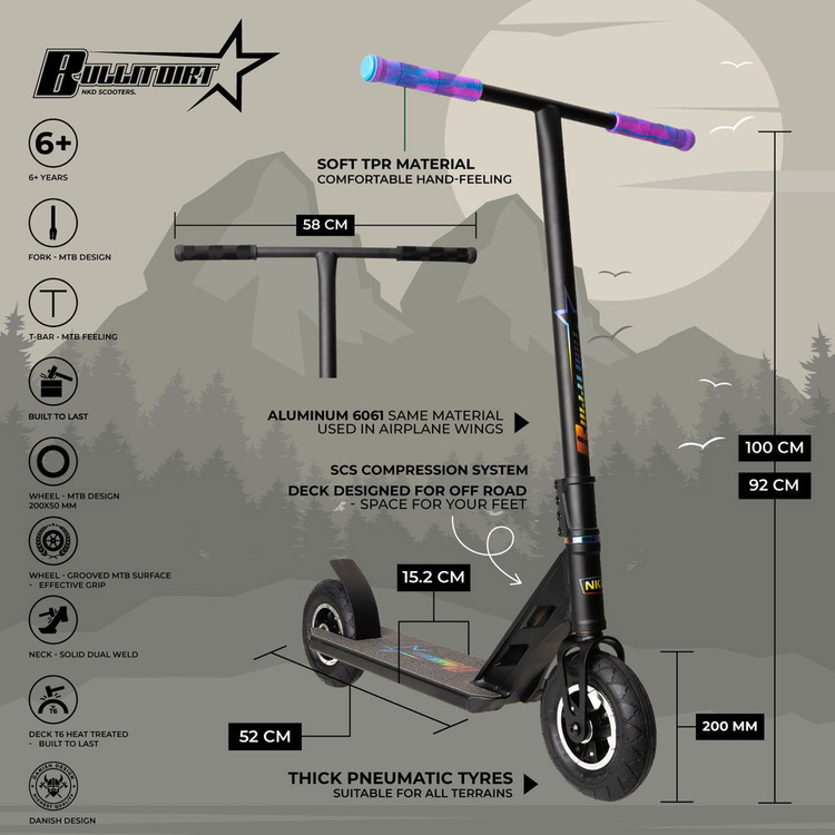 • NKD Bullit Dirt Scooter to terenowa hulajnoga wyczynowa z dużymi, pompowanymi, bardzo wytrzymałymi kołami MTB. Stworzona do jazdy i wykonywania tricków niemal w każdym terenie.