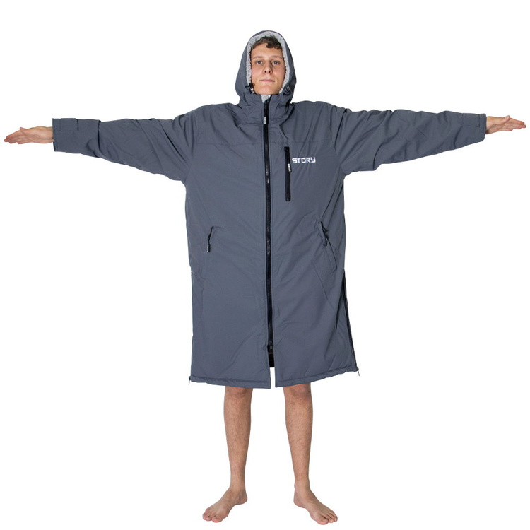 Story Change Robe to kurtka z długim rękawem sięgającym do kolan, która stanowi idealne rozwiązanie zarówno po zimowym morsowaniu, jak i po sesji surfingu, pływaniu, kajakarstwie czy nurkowaniu. Dzięki wodoodpornej i wiatroszczelnej warstwie zewnętrznej poncho doskonale sprawdza się w trudnych warunkach atmosferycznych. Świetnie ogrzewa po kąpieli w zimnym morzu, osłania przed chłodnym wiatrem na plaży oraz zapewnia komfort w trakcie jazdy na rowerze czy spacerów w deszczu.
